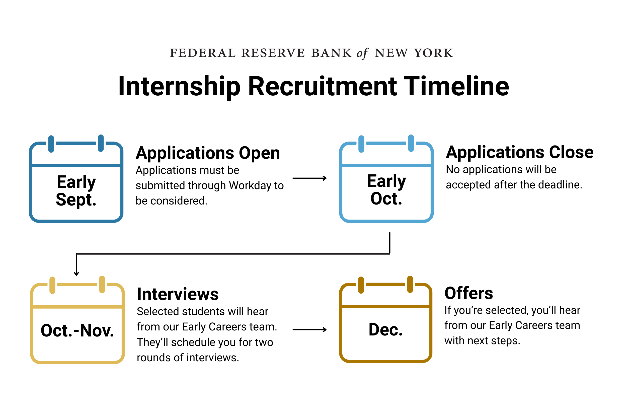 At the end of the program, students leave with strong skills, professional connections, and meaningful experiences that will support them in their long-term careers. The New York Fed’s internships are available for undergraduates (sophomores and juniors) and graduate students. Each of the summer programs begin in early June.