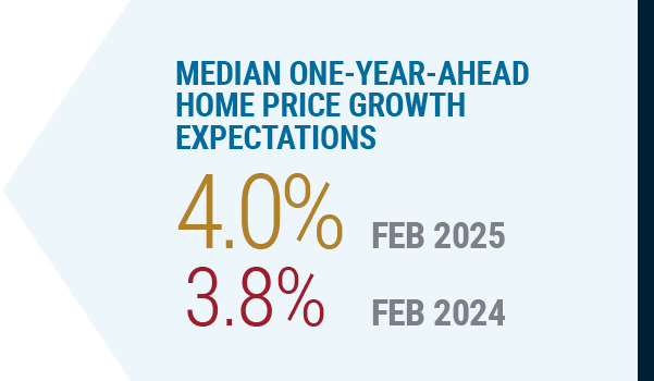 - Households expect home price growth to increase to a median of 4.0 percent over the next twelve months, up from 3.8 percent a year ago. One-year growth expectations have risen in each of the last two years; however, the rise in expected growth slowed in 2025. Expectations over the five-year horizon remained flat, with households anticipating median annualized price growth of 3.1 percent, the same reading as in 2024.