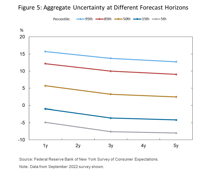 In terms of the uncertainty criterion, uncertainty does not increase linearly with the forecast horizon in the SCE. Figure 5 shows the distributions of aggregate uncertainty for one-, three-, and five-year-ahead inflation forecasts from September 2022. As Figure 5 shows, the distributions are very similar for the different forecast horizons. This seems consistent with the evidence that many respondents view the inflation surge as reflecting a unique set of developments.16