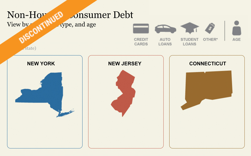 Regional Indicators of Consumer Debt offered interactive charts showing key indicators for four categories of debt—including credit cards, auto loans, student loans, and other non-housing loans—for New York, New Jersey, and Connecticut by age group, delinquency, and credit score. The charts were generated primarily from data available through the New York Fed Consumer Credit Panel consisting of detailed Equifax credit-report data for a unique longitudinal quarterly panel of individuals and households from 1999 to 2012. Population data are from the U.S. Census Bureau’s American Community Survey, 2011 one-year estimates.