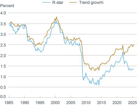 Note: We plot estimates of the natural rate of interest (r-star) along with those for the trend growth rate of the U.S. economy, a source of change driving r-star.